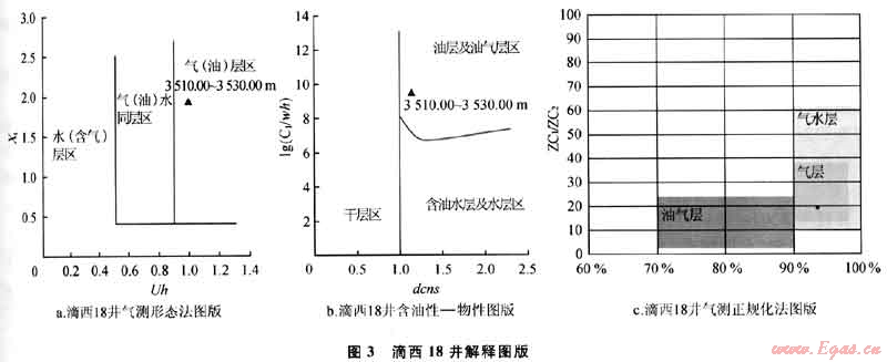 錄井綜合氣測(cè)解釋評(píng)價(jià)、常規(guī)地質(zhì)資料判斷地層不含水,解釋為氣層。后在井段3510.00~3530.O0m試油,日產(chǎn)油26.93t,氣25.006×104m3,試油結(jié)論為氣層。