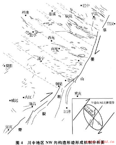 值得指出,川中地區(qū)上述兩種類(lèi)型的NW向構(gòu)造形跡是疊加在NE向構(gòu)造背景上,其形成時(shí)間應(yīng)是燕山晚期-喜馬拉雅期。