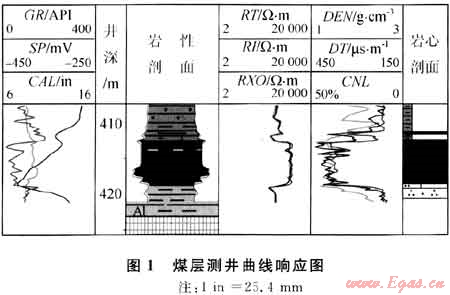 由于煤巖所具有的特殊屬性,煤層的測井響應(yīng)很特殊,比圍巖較易識別,具體表現(xiàn)為“三高兩低”的特征,即:高電阻、高聲波時差、高中子、低伽馬、低體積密度(圖1)。