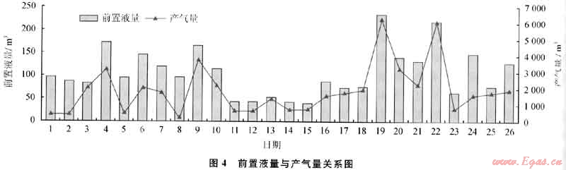 在韓城地區(qū),通過對33口井(其中30口使用活性水壓裂液,3口井使用清潔壓裂液)的排采效果進行統(tǒng)計分析,結(jié)果表明:采用活性水壓裂液壓裂的井比用清潔壓裂液的井產(chǎn)氣效果好;產(chǎn)氣量和前置液量具有很好的正相關(guān)關(guān)系(圖4);加砂量和產(chǎn)氣量也具有一定的正相關(guān)關(guān)系,但砂比和產(chǎn)氣量之間沒有很明顯的相關(guān)性。
