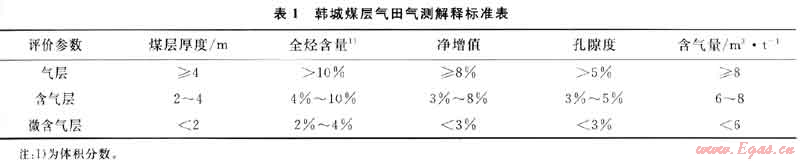 地質(zhì)錄井是煤層氣勘探開發(fā)中最常應(yīng)用的錄井技術(shù),包括鉆時、巖屑、巖(煤)心、鉆井液性能、氣測等項目的錄取工作。其中,氣測錄井是指直接測定鉆井液攜帶的破碎煤層中可燃性氣體含量的一種測井方法,然后根據(jù)氣層解釋標(biāo)準(表1),結(jié)合巖石電性特征,判定氣測異常層是氣層還是含氣層。
