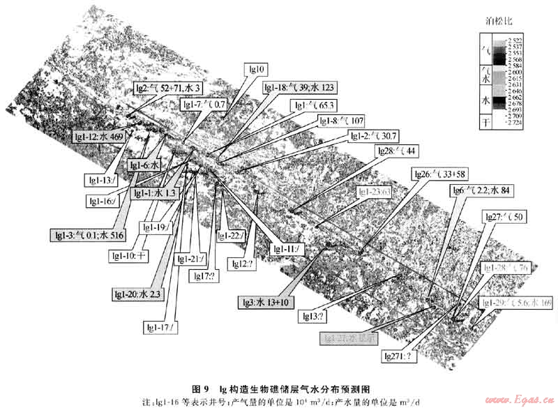 圖9為lg構造二疊系生物礁儲層氣水分布預測圖。該圖展示,構造中部北東南西向有一明顯分界線,西南(左下半部)為臺地相沉積區(qū),西北部為海槽,中間為臺緣。預測臺地為含水及差儲層區(qū),中間為臺緣部位,為預測的含氣帶,東北部為海槽,預測出大片含氣區(qū)。該構造儲層段鉆探大量井位,前期在臺緣部位取得較好效果,高產(chǎn)井較多(黃色、綠色文字框所示),但后來鉆遇大量氣水井或水井(綠色或藍色文字框所示),尤其在臺地部位部署的井位基本上為干井或水井(白色或藍色文字框所示),獲氣井很少。氣水預測結果與實鉆結果基本吻合。預測還表明,該區(qū)海槽部位還有大片含氣區(qū),但該區(qū)僅有l(wèi)g10井鉆達目的層,且不產(chǎn)氣,雖然該井預測與實鉆吻合,但沒有更多的井來證實,且該區(qū)儲層情況還存在認識上的爭議,要靠將來的實鉆進一步驗證。