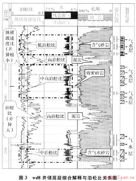 圖3為四川盆地wd8井測井綜合解釋圖。該網(wǎng)直觀展示出泊松比曲線與巖性、流體具有明顯的對應關系,且與前人研究結論完全一致。