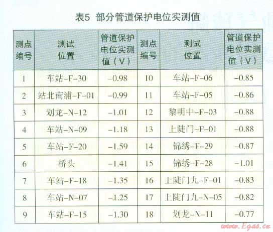 區(qū)域二兩座深井陽極安裝后,對管網(wǎng)進(jìn)行了-段時間的極化,各測試點保護(hù)電位測試結(jié)果見表5,大多數(shù)檢測點的電位在-0.85V至-l.5V之間,達(dá)到了保護(hù)電位,但也有小部分電位在-0.85V以卜達(dá)不到保護(hù)電位,個別在-1.5v以下,管網(wǎng)處于過保護(hù)狀態(tài)。
