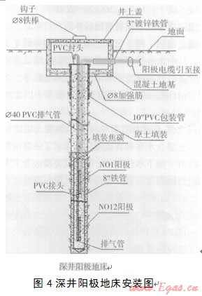 公司于2011年3月苗‘先啟動了Ⅸ域二的深井陽極電流保護(hù)工程。經(jīng)計算管道保護(hù)面積為19 631m2,設(shè)計保護(hù)電流密度為lomA/m2,保護(hù)總電流為196A,在南浦氣化站和位于車站大道的公用集團(tuán)內(nèi)各設(shè)置1座深井陽極陰極保護(hù)站。每個站內(nèi)設(shè)l00A/100V恒電位儀2臺,-開-備。在站內(nèi)距離管線50m~100m的低洼潮濕、土層較厚處鉆建直立式陽極地床,升深60m,井內(nèi)裝分段預(yù)制型陽極體7組,規(guī)格為Ф325×6 000,內(nèi)裝Ф75×1 500高硅鑄鐵陽極3支。將高硅鑄鐵陽極、高性能碳素填料,PVC排氣管,部分陽極引線電纜,井套管組合裝配為-體,便于運輸和安裝,并可保證裝配精度和質(zhì)量(圖4)。每500m左有設(shè)置-個測試樁或在原有閥門井內(nèi)設(shè)置測試點。對于平行或跨越管道按-定間距或在最接近處作均壓處理,使電位分布均衡。
