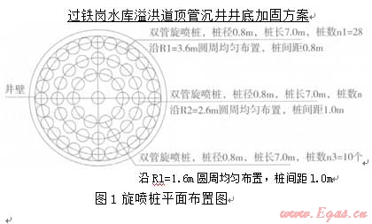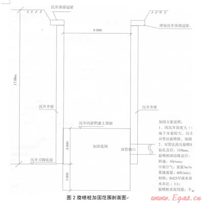 要加同沉井內(nèi)虛土,首先想到的是旋噴樁。眾所周知,旋噴樁是一種適合于加固軟土的很好地基處理方法,但其施工一般是在地面上進行。旋噴樁若要在深度達l7m、而其中上部還要架空約13m的沉井內(nèi)施工卻是從未曾有人嘗試過。旋噴樁施工隊伍也擔心架空l3m可能無法施工、加固效果很難保證。經(jīng)過仔細分析,我們大膽提出,只要采取的措施得法,旋噴樁是可以用于加固沉井內(nèi)虛土并起到止水作用的。通過現(xiàn)場指導施工,落實各項施工措施,最終證明,旋噴樁加固效果良好,虛土加同后,井底未出現(xiàn)涌砂、涌土現(xiàn)象,順利清除了井底虛土,保證了沉井順利封底。見圖l、圖2。