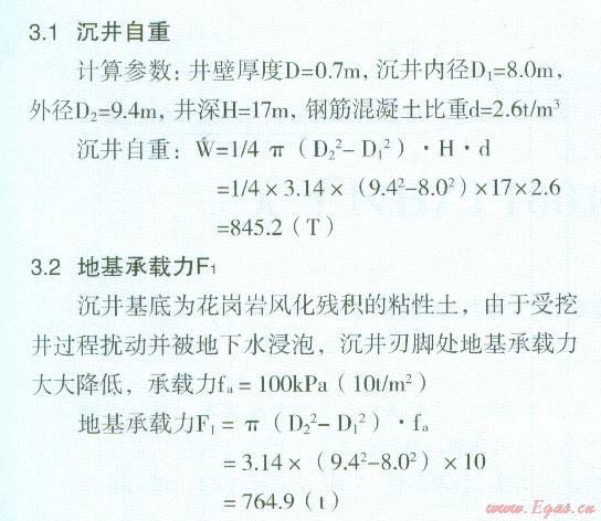 上述簡單計算可以看出,沉井白重(W)大于地基承載力(F1)與沉井側壁摩阻力(F2)之和,所以沉井出現(xiàn)自動下沉。