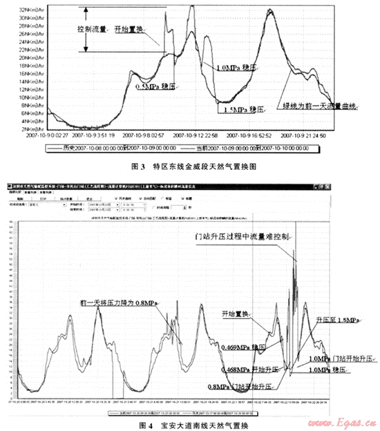 (3) 按有關(guān)規(guī)范的要求,置換時(shí)的流速應(yīng)控制在5m/s。通過粗略計(jì)算將流速控制折算成流量控制,建立流量控制表,通過SCADA系統(tǒng)門站瞬時(shí)流量,結(jié)合前一天的流量曲線,算出增量,將增量與流量控制表對比,及時(shí)通知現(xiàn)場進(jìn)氣閥門操作人員進(jìn)行調(diào)整。將流量控制在規(guī)范范圍。同時(shí)也保證了流量較為平穩(wěn),將對上游的影響降到最低。