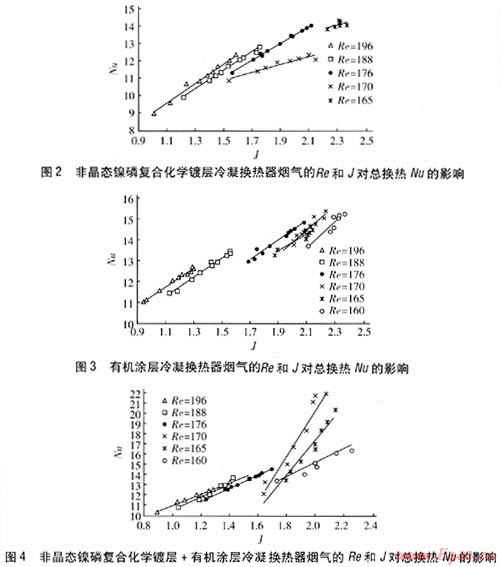 非晶態(tài)鎳磷復(fù)合化學(xué)鍍層冷凝換熱器煙氣的Re和J,對總換熱Nu的影響見圖2,有機(jī)涂層冷凝換熱器煙氣的Re和J對總換熱Nu的影響見圖3,非晶態(tài)鎳磷復(fù)合化學(xué)鍍層+有機(jī)涂層冷凝換熱器煙氣的Re和J對總換熱№的影響見圖4。