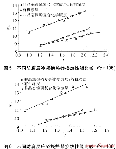 本實驗通過對不同防腐層冷凝換熱器換熱性能的測定得出,冷凝換熱器換熱性能不僅隨Re和J的增大而增強,而且對于不同防腐層的冷凝換熱器,其換熱性能隨Re和J的變化速率也不同;在相同工況下,3種不同防腐層的冷凝換熱器的換熱性能不同,非晶態(tài)鎳磷復(fù)合化學(xué)鍍層+有機(jī)涂層冷凝換熱器換熱能力最強,有機(jī)涂層冷凝換熱器換熱能力與非晶態(tài)鎳磷復(fù)合化學(xué)鍍層冷凝換熱器換熱能力相當(dāng)。
