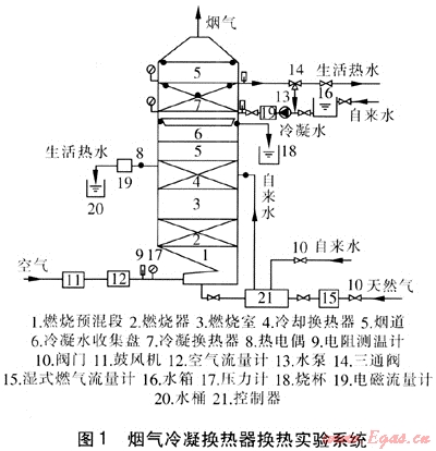 本實驗臺是在普通燃?xì)鉄崴魃霞友b冷凝換熱器而成。實驗系統(tǒng)由3部分組成:氣(包括天然氣、空氣、煙氣)系統(tǒng)、水系統(tǒng)和控制系統(tǒng)。實驗系統(tǒng)見圖1。