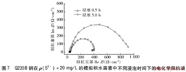 圖7為Q235B鋼在ρ(S2-)=20mg/L的模擬積水溶液中分別浸泡0.5h和浸泡5h所得的電化學阻抗譜。由圖7可知,隨浸泡時間的不同,Nyquist圖的形狀有明顯不同。浸泡時間短時,Nyquist圖由一個高頻容抗弧和一個低頻小感抗弧組成。當浸泡時間由0.5h增大到5h時,Nyquist圖表現(xiàn)為一個大容抗弧,低頻感抗弧已經(jīng)消失,且大容抗弧的半徑顯著變大,即其阻抗增大。說明在模擬積水溶液中,隨著浸泡時間的延長,S2-對Q235B鋼表面電化學反應的抑制作用增強。
