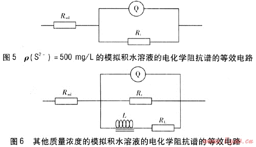 根據(jù)Q235B鋼在該腐蝕體系中的阻抗譜特征,應用圖5和圖6所示的等效電路對圖3中的EIS數(shù)據(jù)進行擬合,圖5為ρ(S2-)=500mg/L的模擬積水溶液的電化學阻抗譜的等效電路,圖6為其他質(zhì)量濃度模擬積水溶液的電化學阻抗譜的等效電路。