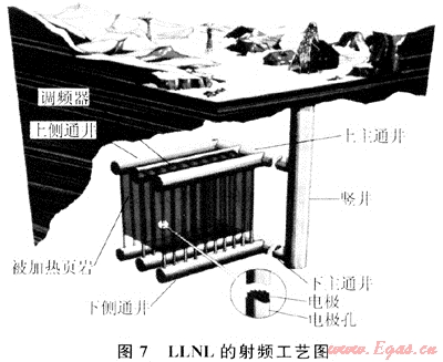 1970年代后期美國伊利諾理工大學(xué)提出利用射頻加熱油頁巖。該技術(shù)利用垂直組合電極緩慢加熱大規(guī)模深層的頁巖層。后來由Lawrence Livermore國家實驗室(LLNL)進行開發(fā)。LLNL提出利用無線射頻的方式加熱頁巖,克服了傳導(dǎo)加熱需要大量的熱擴散時間的缺點。具有穿透力強,容易控制等優(yōu)點(圖7)[12~14]。