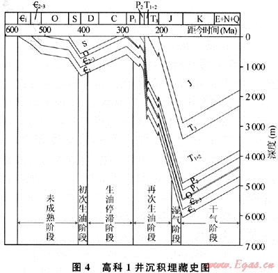 根據(jù)高科1井的沉積埋藏史圖(圖4)可見,樂山-龍女寺古隆起區(qū)下寒武統(tǒng)源巖經(jīng)歷了埋藏-抬升(剝蝕)-再埋藏-再抬升的演化過程。其有機(jī)質(zhì)生烴史可分為三期:第一期為初始生烴階段:高科1井下寒武統(tǒng)源巖在志留紀(jì)末R。值已達(dá)0.7%,處于未成熟一低成熟生烴期;第二期為生烴停滯階段,由于加里東運(yùn)動(dòng)的抬升作用,該井下寒武統(tǒng)源巖埋深變淺并遭受剝蝕,古地溫降低,有機(jī)質(zhì)進(jìn)入生烴滯流階段;第三期為“二次生烴”階段:從二疊系開始至二疊系末,下寒武統(tǒng)源巖埋藏深度及其所具有的古地溫已超過了初始生烴階段,源巖進(jìn)入了二次生烴階段。此時(shí),高科1井毛。源巖Ro值已達(dá)0.71%,有機(jī)質(zhì)開始繼續(xù)生烴。印支末期,高科1井