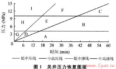 評(píng)價(jià)點(diǎn)”的壓力值代表井底欠平衡程度,亦代表最大關(guān)井井口壓力,因此需要用幾條壓力值線來區(qū)分壓力級(jí)別[8]。從起始恢復(fù)點(diǎn)到該評(píng)價(jià)點(diǎn)的連線的斜率表示關(guān)井壓力恢復(fù)的快慢,取決于地層氣體侵入井筒能力的大小,代表著地層系數(shù)的大小。因此需要用始于起始恢復(fù)點(diǎn)的幾條不同斜率的直線來區(qū)分地層系數(shù)級(jí)別。這樣,關(guān)井壓力恢復(fù)圖版應(yīng)包括幾條壓力級(jí)別水平線和幾條地層系數(shù)級(jí)別斜線。圖1中關(guān)井壓力恢復(fù)圖版中的低中壓界限和中高壓界限為兩條水平線(壓力值分別為4MPa和10MPa),用以界定關(guān)井壓力恢復(fù)評(píng)價(jià)點(diǎn)的幅值,低中地層系數(shù)界限和中高地層系數(shù)界限為兩條斜線(斜率分別為25°、50°),用以界定關(guān)井壓力恢復(fù)的斜率,即關(guān)井壓力恢復(fù)的快慢。