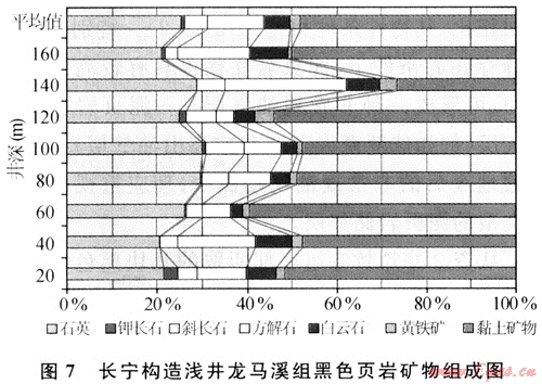 實際上,廣義的頁巖氣還應(yīng)該包括儲存在黑色頁巖所夾的薄層泥質(zhì)粉砂巖和各種砂巖中的天然氣。這些泥質(zhì)粉砂巖和砂巖相對純頁巖而言有較多的孔隙,因此儲存于其中的天然氣多為游離氣,可隨頁巖中的吸附氣一并采出。四川盆地這兩套黑色頁巖普遍含砂質(zhì),淺色石英粉砂微細紋層與暗色泥質(zhì)層交互沉積而顯水平紋理,石英分布不均,局部富集而成泥質(zhì)粉砂巖。此外,頁巖中還微含鈣質(zhì),底部多含硅質(zhì),黃鐵礦也較豐富,多呈星散狀分布。對長寧構(gòu)造龍馬溪組黑色頁巖巖心樣品的礦物成分分析結(jié)果也表明,石英含量在20%~30%之間,方解石和白云石含量多在10%~25%,高者可達35%,黃鐵礦含量在1%~4%之間(圖7)。由于黑色頁巖砂質(zhì)和鈣質(zhì)較重,因此其性較脆、硬,在加砂壓裂中容易產(chǎn)生裂縫,這對于頁巖氣的開采極為有利。