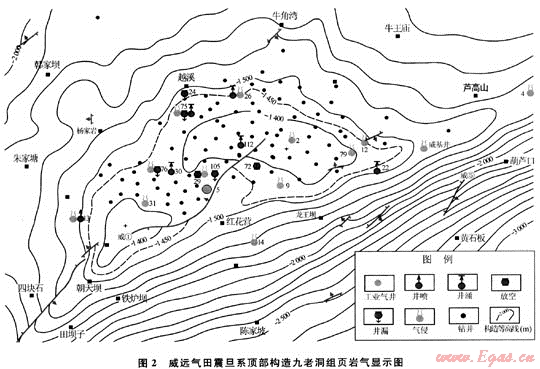 前已述及,威遠氣田鉆穿下寒武統(tǒng)九老洞組的107口井中,有29口井在九老洞組頁巖中的不同井段出現(xiàn)了不同級別的天然氣顯示,筆者將這些顯示井分別標注在威遠氣田震旦系頂面構(gòu)造圖上(圖2)。由圖可見,九老洞組頁巖氣顯示井的平面分布及顯示特點與下伏震旦系氣井的分布控制因素完全不同。九老洞組頁巖中的氣顯示井不僅在構(gòu)造的軸部、翼部及氣水邊界內(nèi)有分布,尤其值得注意的是在該氣田氣水邊界外的東、西、南、北各個方向均有顯示井分布。如威遠構(gòu)造西南的威18井已遠離威遠氣田的氣水邊界達16km,但在九老洞組的中部和下部還是出現(xiàn)了3個強烈的氣顯示井段(兩個氣顯示段達井涌、1段為氣侵)。其中3361.5~3363.5m顯示段,在鉆井過程中放空0.3m,并發(fā)生井涌。氣測全烴由55%增至100%,泥漿噴出轉(zhuǎn)盤面0.5m,氣侵、井涌猛烈,且持續(xù)井涌時間長達2a。