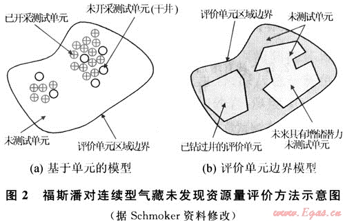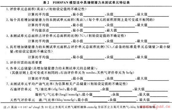 福斯潘模型(FORSPAN)法是USGS在1999年為連續(xù)型油氣藏資源評(píng)價(jià)而提出的一種評(píng)價(jià)方法。該方法以連續(xù)型油氣藏的每一個(gè)含油氣單位為對(duì)象進(jìn)行資源評(píng)價(jià),即假設(shè)每個(gè)單元都有油氣生產(chǎn)能力,但各單元間汗油氣性(包括經(jīng)濟(jì)性)可以相差很大,以概率形式對(duì)每個(gè)單元的資源潛力作出預(yù)測(cè)。以往也用體積法對(duì)連續(xù)型油氣藏資源潛力作過評(píng)價(jià)。在體積法中,原始資源量估算常用的參數(shù)主要是一些基本地質(zhì)參數(shù)(如面積、厚度、孔隙度等),這些參數(shù)有很大的不確定性,且各單元間關(guān)系密切、缺乏獨(dú)立性。因此,參數(shù)選取及標(biāo)準(zhǔn)確定較困難。福斯潘(FORSPAN)法建立在已有開發(fā)數(shù)據(jù)基礎(chǔ)上(圖2),估算結(jié)果為未開發(fā)原始資源量。因此,該方法適合于已開發(fā)單元的剩余資源潛力預(yù)測(cè)。已有的鉆井資料主要用于儲(chǔ)層參數(shù)(如厚度、含水飽和度、孔隙度、滲透率)的綜合模擬、權(quán)重系數(shù)的確定、最終儲(chǔ)量和采收率的估算。如果缺乏足夠的鉆井和生產(chǎn)數(shù)據(jù),評(píng)價(jià)可依賴各參數(shù)的類比取值。