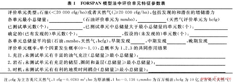 福斯潘法涉及參數(shù)眾多,基本參數(shù)有評(píng)價(jià)目標(biāo)特征、評(píng)價(jià)單元特征、地質(zhì)地球化學(xué)特征和勘探開發(fā)歷史數(shù)據(jù)等(見表1、2)[3]。USGS在2003年、2008年用該方法對(duì)沃斯堡盆地Barnett頁(yè)巖氣資源做了估算,2003年評(píng)價(jià)結(jié)果為7400×108m3,2008年評(píng)價(jià)結(jié)果為2.66×108m3。兩次評(píng)價(jià)相差3.6倍,原因在于沃斯堡盆地頁(yè)巖氣藏含氣范圍擴(kuò)大至原來的3倍,整個(gè)盆地成為有利頁(yè)巖氣產(chǎn)區(qū),其次是頁(yè)巖氣井生產(chǎn)周期變長(zhǎng),由初期評(píng)價(jià)時(shí)的30a增長(zhǎng)到50a,其核心產(chǎn)區(qū)的生產(chǎn)周期甚至估算結(jié)果不是一成不變,是動(dòng)態(tài)評(píng)價(jià)過程,同時(shí)也說明了頁(yè)巖氣資源的復(fù)雜性。