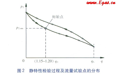 初始狀態(tài)設(shè)定完畢后的靜特性檢驗過程及流量試驗點的分布如圖2所示(以標稱出口壓力設(shè)定值為p2,min為例)。