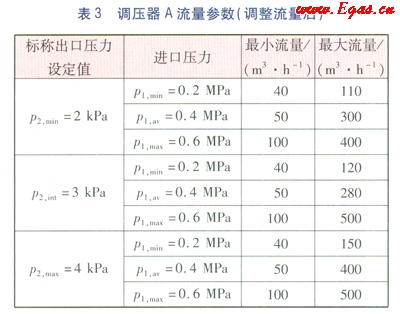 按照上述方法,根據(jù)表3中調(diào)整后的流量參數(shù),繪制調(diào)壓器標稱出口壓力p2,min=2kPap2,max=4kPa條件下的靜特性曲線圖(圖省略)。根據(jù)靜特性曲線圖可以得到標稱出口壓力為p2,min=2kPa時,調(diào)壓器A的實際穩(wěn)壓精度Ac,a=4.85<5;實際關(guān)閉壓力等級Sg,a=18.64<20;三條靜特性曲線的實際關(guān)閉壓力區(qū)等級分別為:p1=0.2MPaSz,a=18.55<20,p1=0.4MPaSz,a=7.62<20,p1=0.6MPaSz,a=6.89<20;實際靜特性曲線族的關(guān)閉壓力區(qū)等級為Sz,p,a=19.95<20。根據(jù)靜特性曲線圖可以得到標稱出口壓力為p2,max=4kPa時,調(diào)壓器A的實際穩(wěn)壓精度Ac,a=4.78<5;實際關(guān)閉壓力等級Sg,a=19.05<20;三條靜特性曲線的實際關(guān)閉壓力區(qū)等級分別為:p1=0.2MPaSz,a=17.65<20,p1=0.4MPaSz,a=5.34<20p1=0.6MPaSz,a=4.98<20;實際靜特性曲線族的關(guān)閉壓力區(qū)等級為Sz,p,a=18.76<20。