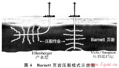 作為目前美國最活躍的頁巖氣遠(yuǎn)景區(qū),沃斯堡盆地Barnrtt頁巖的開發(fā)充分說明了直接及時的微地震描述技術(shù)的重要性[20~21]。經(jīng)營者運用該技術(shù)認(rèn)識到天然裂縫和斷層對水力壓裂裂縫的延伸及儲層產(chǎn)能和開采產(chǎn)生很大影響。2005年,美國Chesapeak能源公司于將微地震技術(shù)運用于一口垂直監(jiān)測井上,準(zhǔn)確地確定了Newark East氣田一口水平井進(jìn)行的4段清水壓裂的裂縫高度、長度、方位角及其復(fù)雜性,改善了對壓裂效果的評價[19]。
