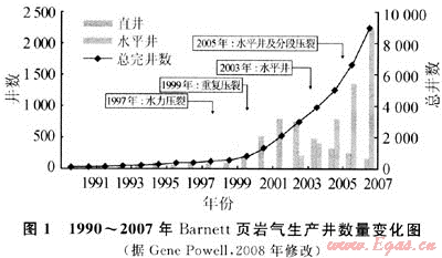開發(fā)技術(shù)的創(chuàng)新尤其是水平井鉆井、壓裂技術(shù)以及裂縫綜合診斷技術(shù)的進(jìn)步與廣泛運用在推動沃斯堡盆地Barnett頁巖氣藏的快速發(fā)展中起著至關(guān)重要的作用。1981年,Barnett頁巖區(qū)在按計劃鉆探過程中偶然發(fā)現(xiàn)顯示良好的Barnett頁巖層段。自1981年第一口發(fā)現(xiàn)井到1992年歷經(jīng)10a生產(chǎn)井僅99口,開發(fā)緩慢。1997年后,水力壓裂開始取代凝膠壓裂成為頁巖氣主要的增產(chǎn)措施,Barnett頁巖氣的開發(fā)也隨之加快了前進(jìn)的步伐。隨著1999年重復(fù)壓裂、2003年水平鉆井以及2005年水平井分段壓裂等一系列新技術(shù)的廣泛運用,Barnett頁巖氣發(fā)展速度驚人(圖2),從1997~2007年的10a時間里,Barnett頁巖氣區(qū)有多達(dá)8629口頁巖氣井投入生產(chǎn)(其中水平井4973口,占50%以上)。新技術(shù)的運用同樣使Barnett頁巖氣產(chǎn)量發(fā)生了翻天覆地的變化,截至2008年1月,Barnett頁巖氣產(chǎn)量約0.996×108m3/d,累計產(chǎn)量1044.9×108m3[3]。