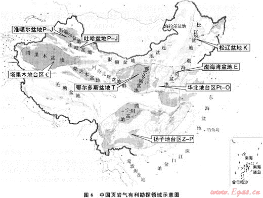 我國中、新生界陸相沉積尤其發(fā)育,并已被勘探開發(fā)實踐證實其中的絕大部分富有機質(zhì)泥頁巖為含油氣盆地中的優(yōu)質(zhì)烴源巖,如松遼盆地下白堊統(tǒng)的青山口組黑色泥頁巖、渤海灣盆地古近系沙河街組的泥頁巖、鄂爾多斯盆地上三疊統(tǒng)延長組的張家灘(T3yc3)、李家畔(T3yc2)頁巖等。前人研究表明,中國北方陸相泥頁巖烴源巖母質(zhì)來源以浮游生物、細菌、高等植物為主,具有多種干酪根類型,TOC平均為2%~3%,最高可達8%,埋深2000~3000m,Ro為0.8%~1.2%,處于液態(tài)烴與氣態(tài)烴并重階段。其中在我國中西部地區(qū)的晚石炭世-二疊紀、晚三疊世-早中侏羅世還發(fā)育兩期煤系沉積,分布廣泛,天然氣資源豐富,煤層氣資源量約16.5×1012m3。對中-下侏羅統(tǒng)煤系沉積進行研究,發(fā)現(xiàn)中-下侏羅統(tǒng)煤系中廣泛發(fā)育高碳泥頁巖,厚度為40~100m,TOC為20%~30%,Ro為0.8%~1.2%,母質(zhì)類型為腐殖型,是一套頁巖氣藏形成的有利目的層系。綜合多種地質(zhì)條件,認為松遼盆地白堊系頁巖,準(zhǔn)噶爾盆地南緣上二疊統(tǒng)、中-下侏羅統(tǒng)頁巖,陜甘寧盆地上三疊統(tǒng)頁巖以及吐哈盆地中-下侏羅統(tǒng)碳質(zhì)頁巖是有利的頁巖氣形成層系和地區(qū)。
