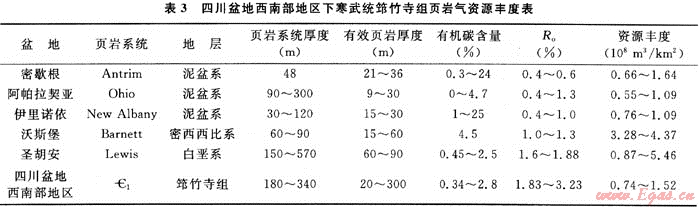 為確定四川盆地西南部地區(qū)下寒武統(tǒng)筇竹寺組頁巖氣資源豐度,筆者在威遠氣田區(qū)實施了1口鉆井密閉取心,并對其進行巖心吸附氣含量測試。威遠氣田區(qū)下寒武統(tǒng)筇竹寺組頁巖有機碳含量為0.34%~2.8%,吸附氣含量0.43~0.86m3/t。需要說明的是根據(jù)區(qū)域地層研究,上述鉆井沒能得到該組中最好的黑色頁巖和碳質(zhì)頁巖段巖心,因此,測得的有機碳與吸附氣含量僅具有不完全代表性,這一問題有待繼續(xù)研究。將筇竹寺組頁巖特征與美國五大頁巖氣含氣盆地對比(見表3),確定出四川盆地西南部地區(qū)下寒武統(tǒng)筇竹寺組頁巖氣資源豐度為0.74×108~1.52×108m3/km2。