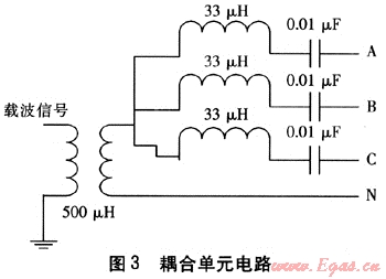 圖2中耦合單元電路見圖3。這個(gè)電路實(shí)際上是通過一個(gè)電感為500μH、匝數(shù)比為1:1的高頻耦合變壓器完成數(shù)據(jù)從載波通信芯片到電力線或電力線到載波通信芯片之間的傳遞。同時(shí)它還保證了電力線和通信電路之間強(qiáng)電和弱電的電氣隔離。在耦合變壓器前分別用三組帶通濾波器直接連接到電力線的A、B、C三相上。耦合變壓器的另一個(gè)輸出端直接和電力線的零線連接。濾波器的電感為33μH,電容為0.01μF。電感和電容串聯(lián)在270kHz的電路時(shí)構(gòu)成串聯(lián)諧振。對(duì)載波信號(hào)來說,它的阻抗幾乎為0,但對(duì)于工頻的信號(hào)阻抗很大。因此,這個(gè)電路能強(qiáng)烈抑制工頻信號(hào)的干擾,但能讓載波信號(hào)順利通過。