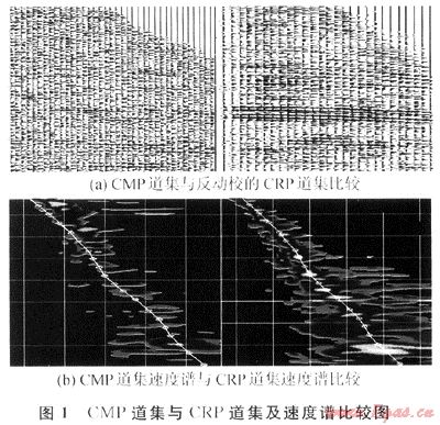 將沿層反演出的疊加速度進(jìn)行傾角校正轉(zhuǎn)換成均方根速度,利用CRP道集反動(dòng)校的方法進(jìn)行速度優(yōu)化(圖1)。從對比圖中可以看出,由于疊前時(shí)間偏移消除了地層傾角和反射點(diǎn)彌散的影響,得到的CRP反映同一反射點(diǎn)的信息,此時(shí)時(shí)距曲線更接近雙曲線理論假設(shè),分析的均方根速度更準(zhǔn)確、更符合地質(zhì)變化規(guī)律。