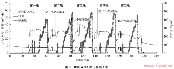 2009年對DX1424井采用小階梯類似線形加砂壓裂,控制前置液比例50%以上,排量確定為4m3/min左右,加砂規(guī)模介于2.0~3.0m3/min,壓裂后日產氣29.0×104m3。