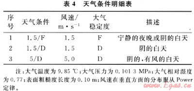 采用QRA計算中常使用的2種大氣穩(wěn)定度D、F,對3種天氣條件進行分別計算。主要的天氣條件如表4。
