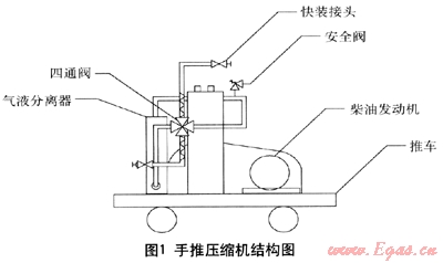 圖1所示的手推式壓縮機采用活塞式小型壓縮機,動力源采用手搖啟動式柴油隔爆發(fā)動機。四通閥主要用于改變管路中氣流前進方向,從而實現(xiàn)不拆卸情況下的輸送方向,滿足卸車和氣相回收的功能。壓縮機出口安裝有安全閥,當?shù)构尴掠螇毫^高時對壓縮機設(shè)備進行保護。整個橇體的進出口采用快裝接頭,使設(shè)備在現(xiàn)場的快速安裝成為可能。