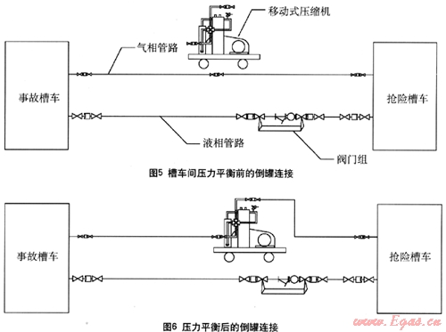(2) 當搶險槽車和事故槽車內(nèi)壓力平衡后,將壓縮機連接到氣相管路,連接完成后的效果如圖6所示,再用壓縮機將搶險槽車中的氣相轉(zhuǎn)移到事故槽車中,迫使事故槽車中LPG繼續(xù)進入搶險槽車。當觀測到視鏡中開始出現(xiàn)氣相時,關(guān)閉柴油發(fā)動機,同時關(guān)閉搶險槽車液相閥門。然后打開氣相管路閥門,調(diào)整四通閥方向進行氣相回收,氣相回收可將槽車內(nèi)的殘液回收出來,最終使槽車內(nèi)僅剩低壓氣相液化石油氣。
