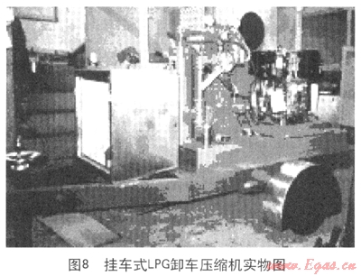 圖7手推式LPG卸車壓縮機可以實現(xiàn)在小片區(qū)域的人工改變位置,從而為小片區(qū)域的多個卸車點進行卸車;圖8為掛車式LPG卸車壓縮機,其中配備了更加齊全的附加設(shè)備,從而實現(xiàn)了大片區(qū)域的不同地點的卸車需求。目前該種移動式應急卸車設(shè)備在香港加德士石油公司、香港加德士石油公司、香港殼牌有限公司及汕頭加德士海洋燃氣有限公司配備使用,應該算作是用于搶險卸車的雛形狀態(tài)。