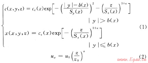 連續(xù)泄漏模型又稱穩(wěn)態(tài)模型,即下風向云團內部的各種性質參數(shù)只是位置的函數(shù)。DEGADIS作為積分模型,假設氣體擴散濃度在側風向上采用修正的高斯分布,而豎直方向上采用指數(shù)分布,并且對風速分布做了假設,其表達式如下: