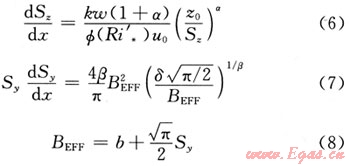 式中下風向不同距離處的擴散系數(shù)Sy(x)、Sz(x),以及特征寬度b(x)、密度ρ(x)和溫度T(x)的求解,需要滿足下列守恒及特征擴散參數(shù)關系。