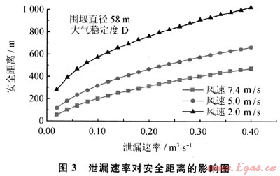 在給定風速條件下,隨著泄漏速率增加,下風向的安全距離也隨之增大(如圖3所示)。泄漏速率大小是影響穩(wěn)態(tài)重氣擴散安全距離的決定因素。
