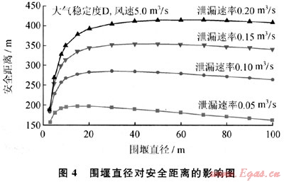 LNG儲罐周圍通常要設計圍堰,以防止儲罐發(fā)生泄漏時,液體四處流淌蔓延,若發(fā)生火災,還可以防止火焰蔓延到周邊地區(qū)[4]。LNG泄漏到圍堰內,會迅速蒸發(fā)氣化,形成以圍堰為二次源的蒸氣云團擴散。圖4給出下風向安全距離隨著圍堰直徑和泄漏速率的變化。當圍堰尺寸較小時,以圍堰為二次源云團的范圍也較小,有限的蒸發(fā)氣受大氣湍流影響,其濃度較快稀釋,安全距離較??;當圍堰尺寸過于增大時,二次源云團的天然氣濃度較低,其下風向擴散距離不再增加,反而略有減少。