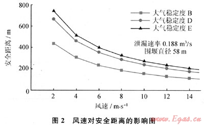 所建立的LNG泄漏氣體擴散模型計算方法,經過實驗驗證,其平均偏差為24.28%,并較準確地體現(xiàn)了重氣擴散過程中云團內部特性的變化規(guī)律。對于穩(wěn)態(tài)LNG氣體擴散,當風速大于2m/s時,隨著風速的增加,安全距離是逐漸減小的;對于較小風速(小于2m/s)時,該穩(wěn)態(tài)模型將不再適用。泄漏速率增大使安全距離幾乎成比例增大,是影響安全距離最重要因素之一。對于給定的LNG泄漏率,圍堰尺寸變化對安全距離的影響會呈現(xiàn)出一個弱峰,之后安全距離會隨圍堰尺寸的增加而略有減小。