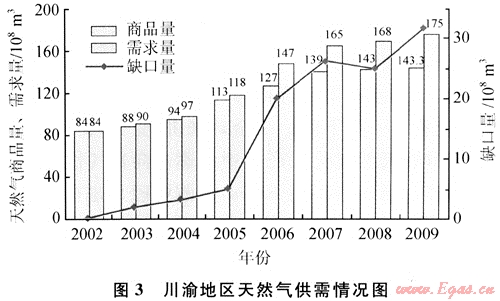 2002年,市場(chǎng)基本能維持平衡,但隨著天然氣市場(chǎng)的快速發(fā)展,各行業(yè)、各部門(mén)對(duì)其的需求量急速增長(zhǎng),導(dǎo)致市場(chǎng)供需缺口越來(lái)越大,市場(chǎng)平衡的任務(wù)愈加繁重。到2009年,市場(chǎng)缺口已經(jīng)高達(dá)30×108m3,如圖3所示。