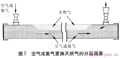 在置換過程中,將天然氣緩慢輸入到新建管道內(nèi),由于天然氣的密度小,相對(duì)密度一般為0.6左右,天然氣就會(huì)在管道的上部流動(dòng),而位于管道下部的空氣或氮?dú)饩蜁?huì)滯留在管道內(nèi)。當(dāng)檢測(cè)人員從出口取樣檢測(cè)時(shí),儀器會(huì)顯示體積分?jǐn)?shù)為100%的天然氣,如果此時(shí)停止置換,滯留在管道內(nèi)的空氣將與天然氣混合,非??赡苄纬杀ㄐ曰旌蠚怏w,在用戶使用時(shí)發(fā)生危險(xiǎn)。這種情況會(huì)給安全運(yùn)行帶來極大的隱患。