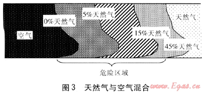 天然氣直接置換方法的特點(diǎn)是比較簡(jiǎn)便也比較經(jīng)濟(jì),但是具有一定的危險(xiǎn)性。因?yàn)樵谥脫Q過程中,管道里必然要產(chǎn)生天然氣與空氣的混合氣體,天然氣的前部氣體與空氣混合后,有一部分的混合氣在爆炸極限內(nèi),很容易在某外界因素的誘發(fā)下(如管道內(nèi)焊渣、金屬顆粒滾動(dòng)等)產(chǎn)生爆炸,因此操作有嚴(yán)格的控制條件和要求,必須嚴(yán)格按規(guī)程實(shí)施,否則非??赡馨l(fā)生事故。對(duì)于天然氣來講,它的爆炸極限為5%~15%,再考慮到其混合的不均勻性,天然氣體積分?jǐn)?shù)在45%以下均應(yīng)視為危險(xiǎn)區(qū)(見圖3,圖中數(shù)據(jù)均為體積分?jǐn)?shù)),遇火源就要發(fā)生爆炸。為此必須嚴(yán)格控制,采取各種安全措施,確保無火源。