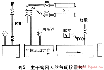 間接置換方法具體操作過程是先將惰性氣體注入管道,在管道末端放散,使用惰性氣體置換出空氣,直至放散管取樣口惰性氣體的體積分?jǐn)?shù)達(dá)到預(yù)定的置換標(biāo)準(zhǔn)為止。在實(shí)際操作過程中一般用氧氣體積分?jǐn)?shù)來衡量,如果連續(xù)2次取樣中的氧氣體積分?jǐn)?shù)達(dá)到2%以下即為合格[1](在英國(guó)的置換要求中,此數(shù)據(jù)為連續(xù)2次測(cè)得取樣中的氧氣體積分?jǐn)?shù)達(dá)到4%以下即為合格[2]),停止通入惰性氣體。然后再將天然氣通入管道,同樣操作,在檢測(cè)管的取樣口取樣,用高精度燃?xì)鈾z測(cè)儀進(jìn)行實(shí)時(shí)的監(jiān)測(cè)分析,如果連續(xù)2次測(cè)得天然氣體積分?jǐn)?shù)達(dá)到95%以上即為合格[1](在英國(guó)的置換要求中,此數(shù)據(jù)為連續(xù)2次測(cè)得天然氣體積分?jǐn)?shù)達(dá)到90%以上即為合格[2]),置換完成。此法操作復(fù)雜、繁瑣,進(jìn)行2次換氣,不僅耗用大量惰性氣體還耗用大量的燃?xì)?,費(fèi)用較高,并且換氣時(shí)間長(zhǎng),工作量大。但是,它可以確保進(jìn)入管道內(nèi)的燃?xì)獠粫?huì)與管道內(nèi)空氣接觸,不會(huì)形成具有爆炸性的混合氣體。因此,此法可靠性好,安全系數(shù)高,成功率也高。主干管網(wǎng)天然氣間接置換見圖5[4]