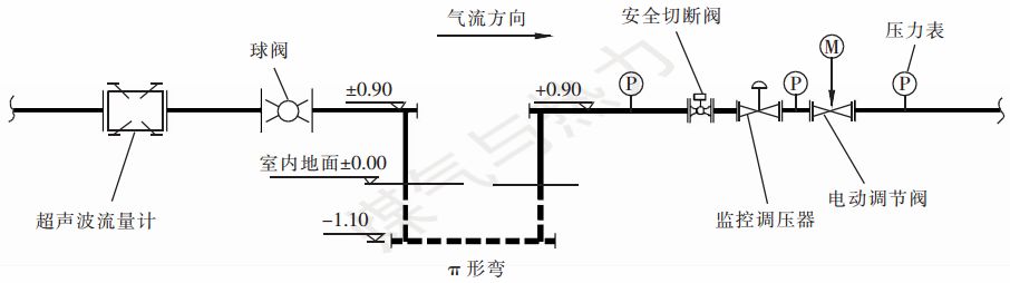 對于電動調(diào)節(jié)閥與超聲波流量計(jì)串聯(lián)設(shè)置對后者的干擾問題,結(jié)合國內(nèi)外先進(jìn)經(jīng)驗(yàn)和作者團(tuán)隊(duì)的深入研究,本站采用π形彎的方式進(jìn)行降噪,即利用4個三通拼接成一個π形[3]。在不同的方案中,可根據(jù)現(xiàn)場條件、場地大小形狀及檢修通道的布置來考慮π形彎是以平行還是垂直于地面的方式布置。π形彎布置[3]見圖1。
