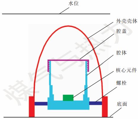 如圖2所示,防水透氣殼的外殼殼體采用橢球狀設計,腔體高度大于外殼殼體高度的1/2。當水位沒過裝置底面達10 m時,防水透氣殼內(nèi)部氣體體積大約被壓縮到原體積的1/2,裝置的外殼殼體采用半橢球形設計,因此,此時外殼殼體內(nèi)水面在外殼殼體高度的1/2位置以下。本裝置腔體的設計高度大于外殼殼體高度的1/2,因此,防水透氣殼內(nèi)的水面位置在腔蓋以下,可以防止液態(tài)水進入腔體內(nèi)??梢姡词乖谒粵]過裝置底面達10 m的惡劣條件下,該裝置仍能夠對腔體內(nèi)的核心元件起到很好的保護作用。