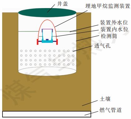 將埋地甲烷監(jiān)測裝置安裝在一個具有承壓及透氣功能的檢測筒內(nèi),檢測筒下方敞口,并與土壤接觸,內(nèi)部無土壤,檢測筒四周打孔,上方設置井蓋,井蓋與甲烷監(jiān)測裝置采用剛性連接,使得甲烷監(jiān)測裝置固定于檢測筒內(nèi),工作人員可以隨時對檢測筒內(nèi)的甲烷監(jiān)測裝置的傳感器及電池進行校準及更換。檢測筒安裝在管道正上方。參考目前的燃氣管道泄漏點定位打孔深度為0.5 m,因此,燃氣檢測筒的通常高度為0.5 m,可根據(jù)管道埋深增加檢測筒高度。甲烷監(jiān)測裝置及檢測筒的布置見圖1。