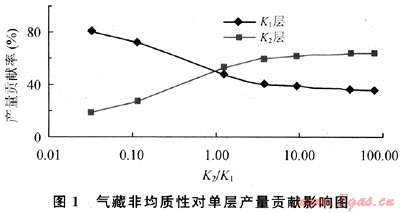 物理模擬實驗研究結(jié)果也證實了這一結(jié)論:兩層合采時,K1層產(chǎn)量貢獻率隨K2/K1比值增加而降低,當(dāng)兩層滲透率相同時各產(chǎn)層產(chǎn)量貢獻率幾乎相同,即兩層都能被充分動用(圖1)。